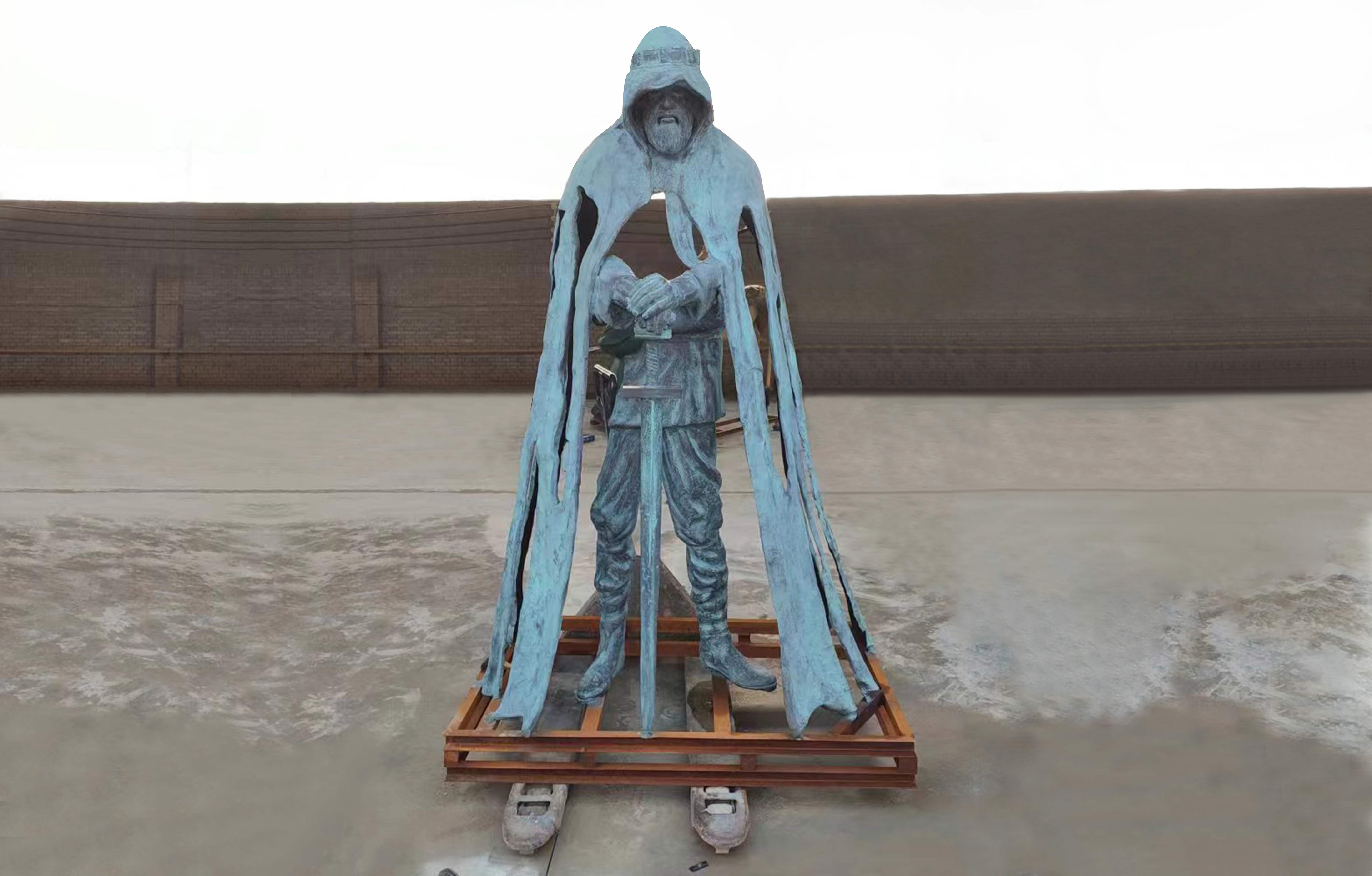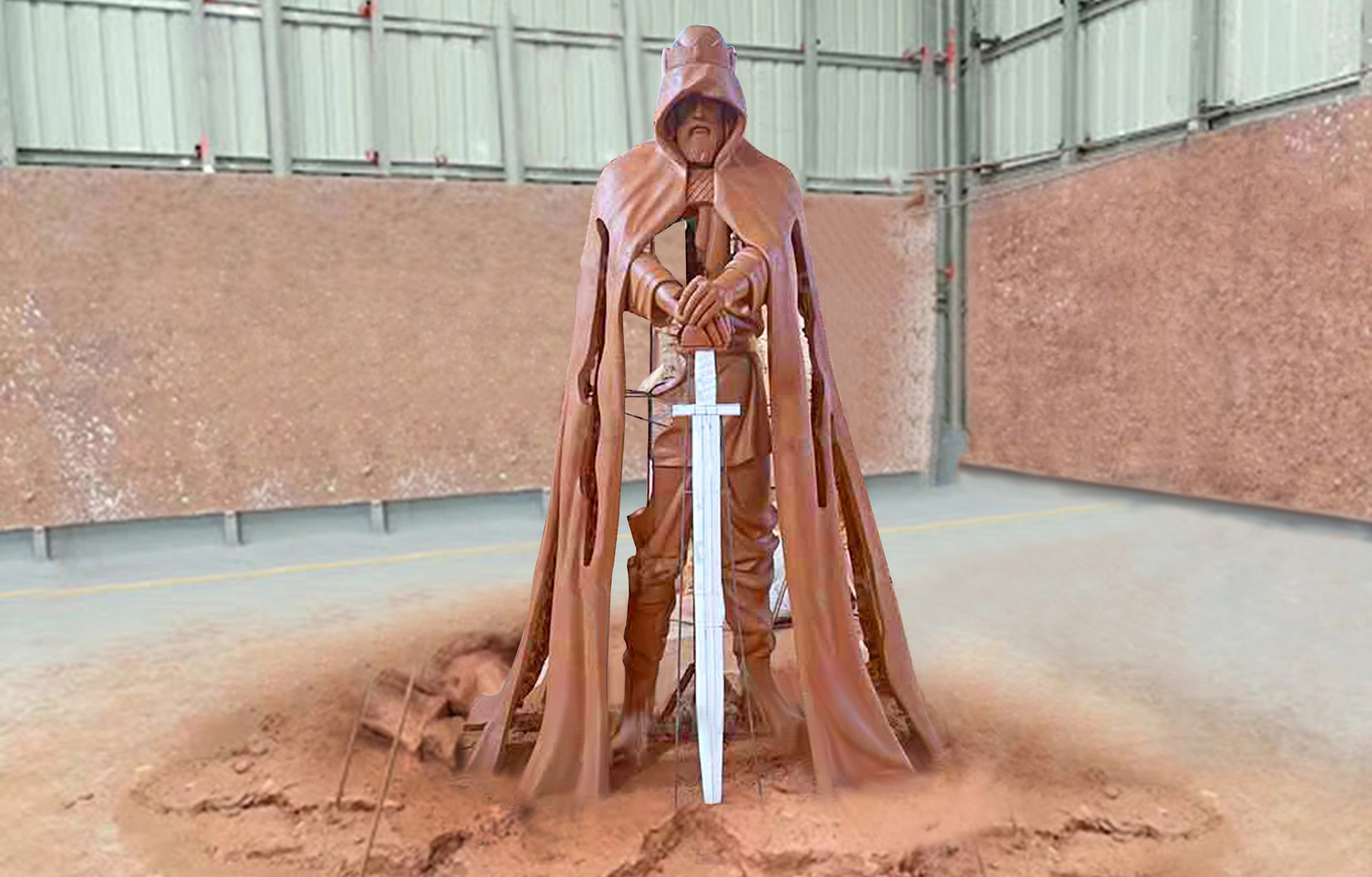 This custom bronze sculpture of King Arthur features a hooded figure standing powerfully with a sword, draped in a flowing, weathered cloak. The antique finish and majestic stance evoke the legendary spirit of the king, symbolizing strength and heroism.