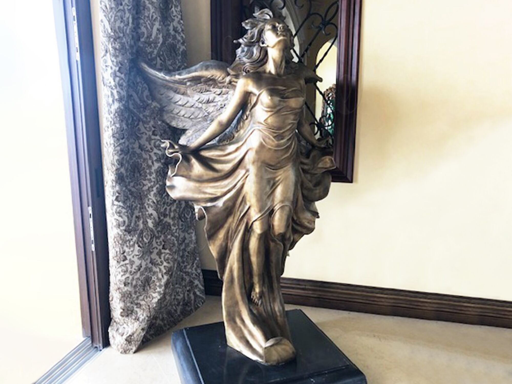 This custom sculpture features an elegant angel with flowing wings and a gracefully draped gown, capturing a sense of movement and serenity. Her upward gaze and flowing hair add a celestial touch, while the bronze tones on a dark base provide a striking contrast, making it a powerful, dignified piece.
