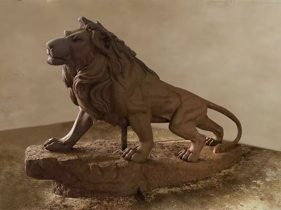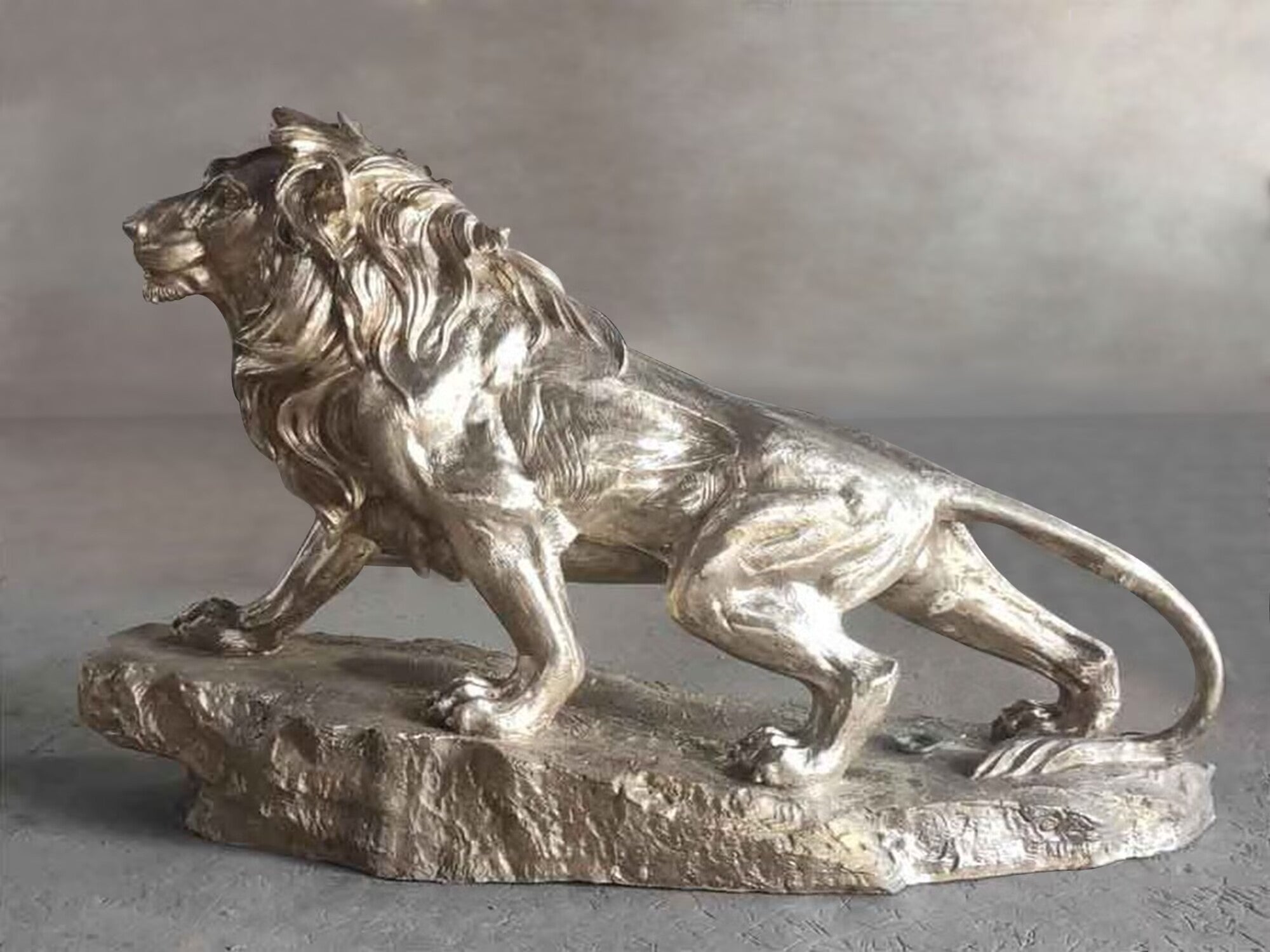 This bronze sculpture portrays a powerful lion standing on a rugged base, showcasing its strength and regal presence with detailed features and a sleek metallic finish.
